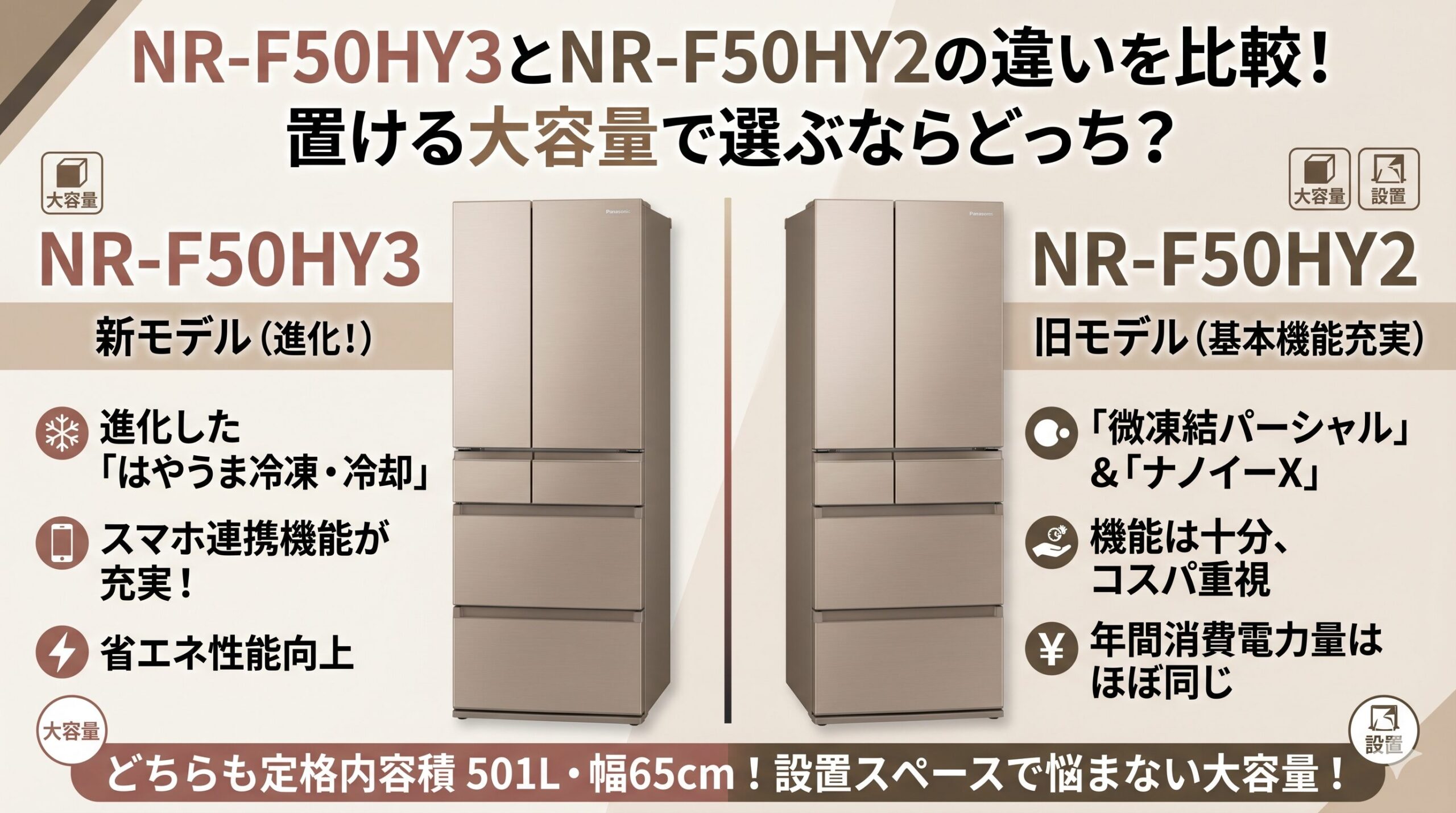 この記事では、NR-F50HY3 と NR-F50HY2 の違いを、設置寸法・容量・冷凍性能・電気代・口コミ・価格バランスの順に比較します。