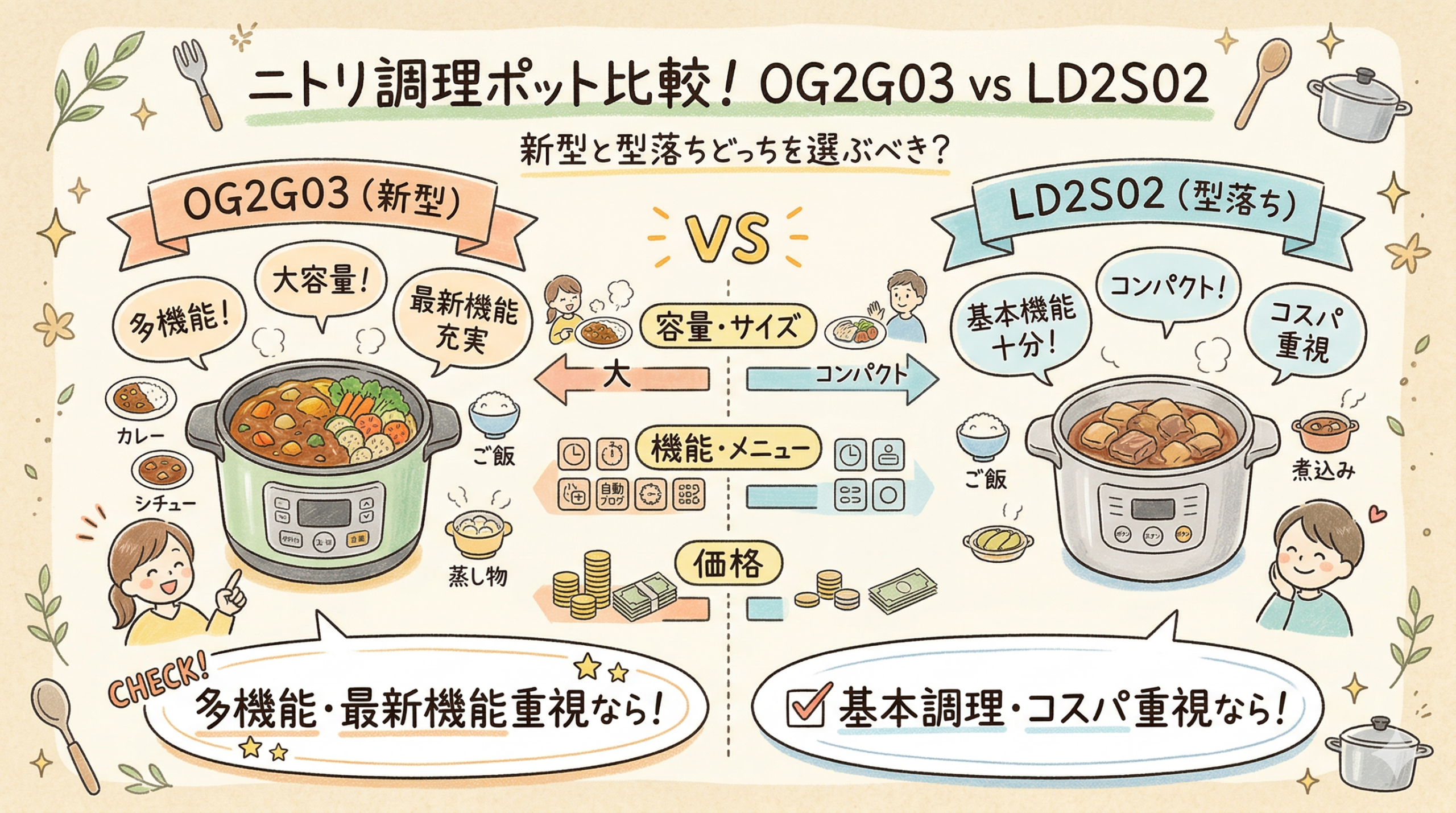結論からいうと、ラーメン・鍋・レトルト中心ならLD2S02、炒める・和えるまで1台でこなしたいならOG2G03 が向いています。
