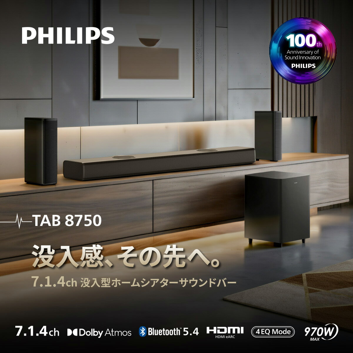 TAB8750のチャンネル数は「7.1.4ch」。末尾の「.4」にご注目ください。これは天井方向への音(ハイトチャンネル)を担う要素が4つあることを示唆しています。