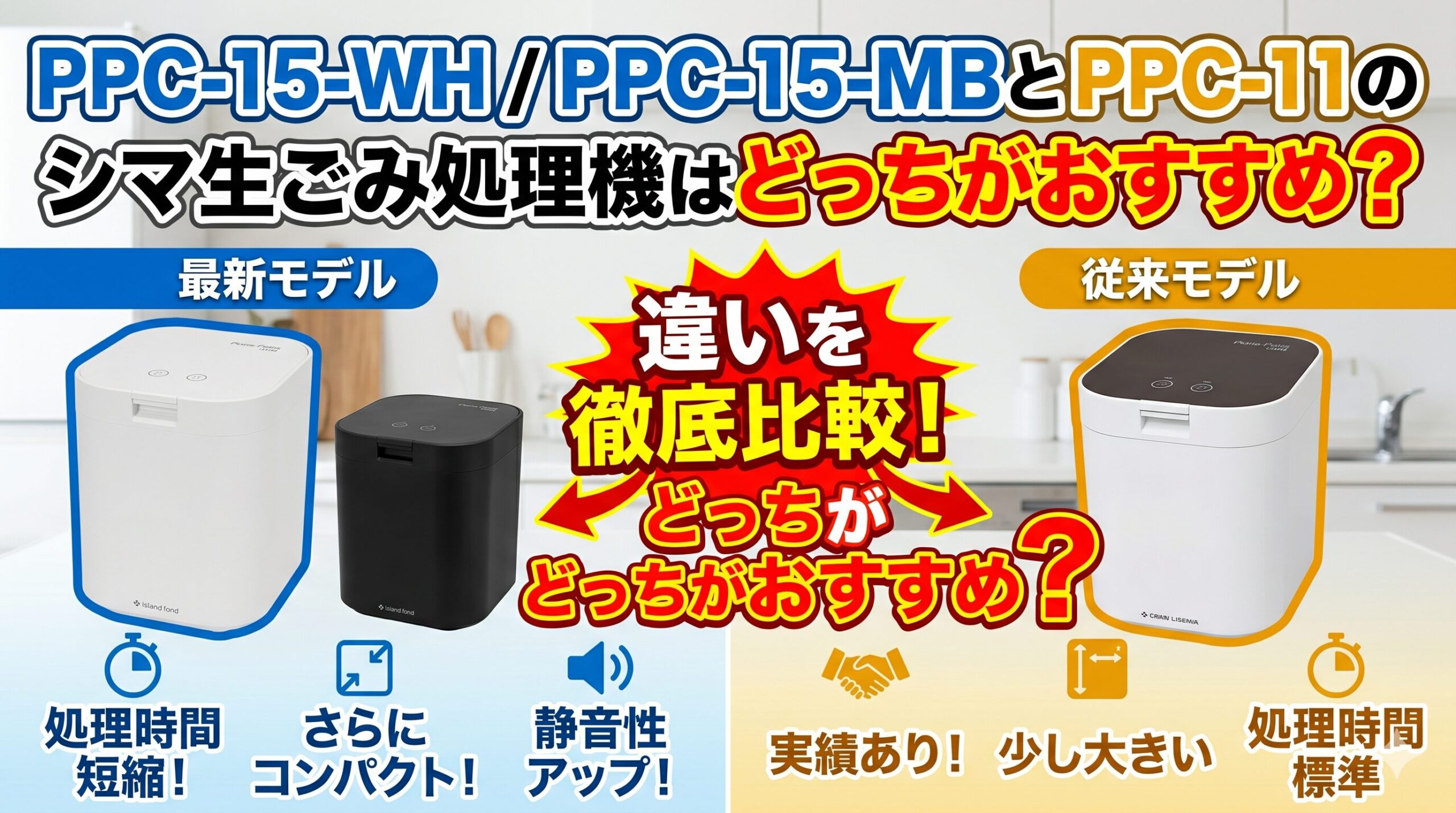 この記事では、処理性、使いやすさ、ニオイ対策、電気代、助成金、口コミ傾向まで整理しながら、PPC-15-WH / PPC-15-MB と PPC-11 の違いを比較します。