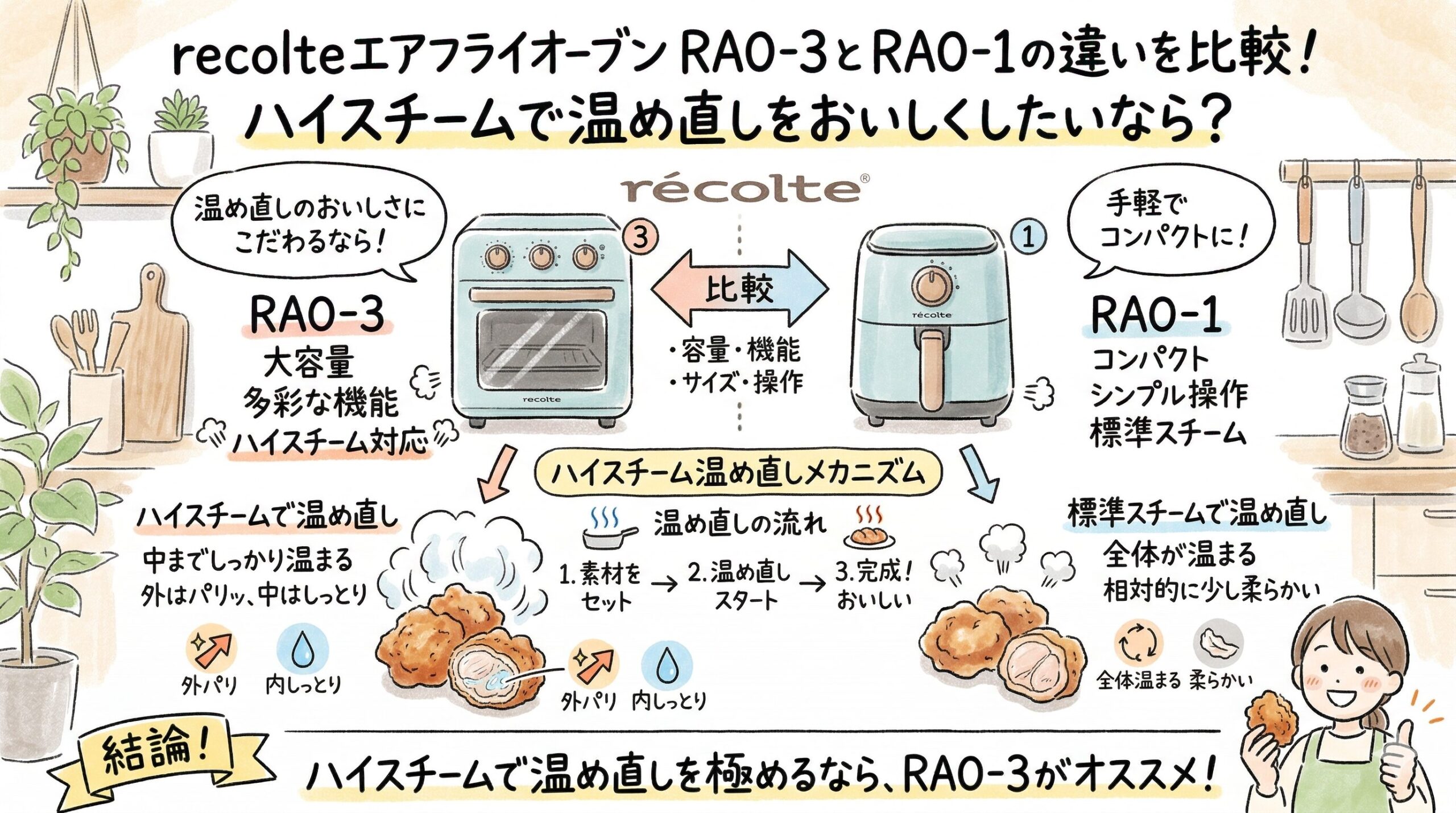 RAO-3とRAO-1の違いを比較!ハイスチームで温め直しをおいしくしたいならどっち?recolteエアフライオーブン