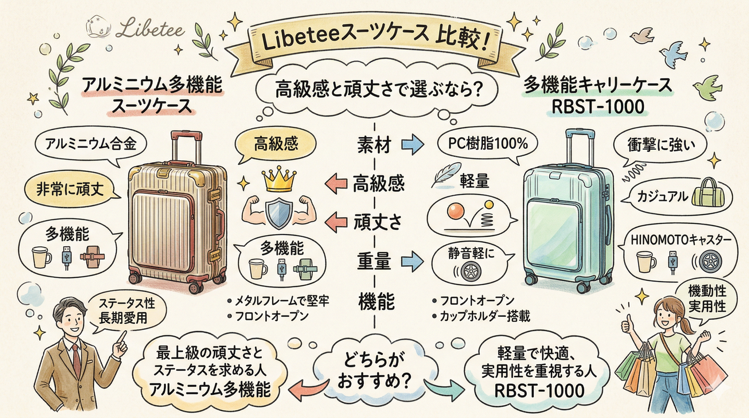 今すぐチェックするなら、上位モデルのLibetee アルミニウム多機能スーツケースと、比較対象のLibetee 多機能スーツケース Sサイズ(RBST-1000系)を見比べるのが早いです。