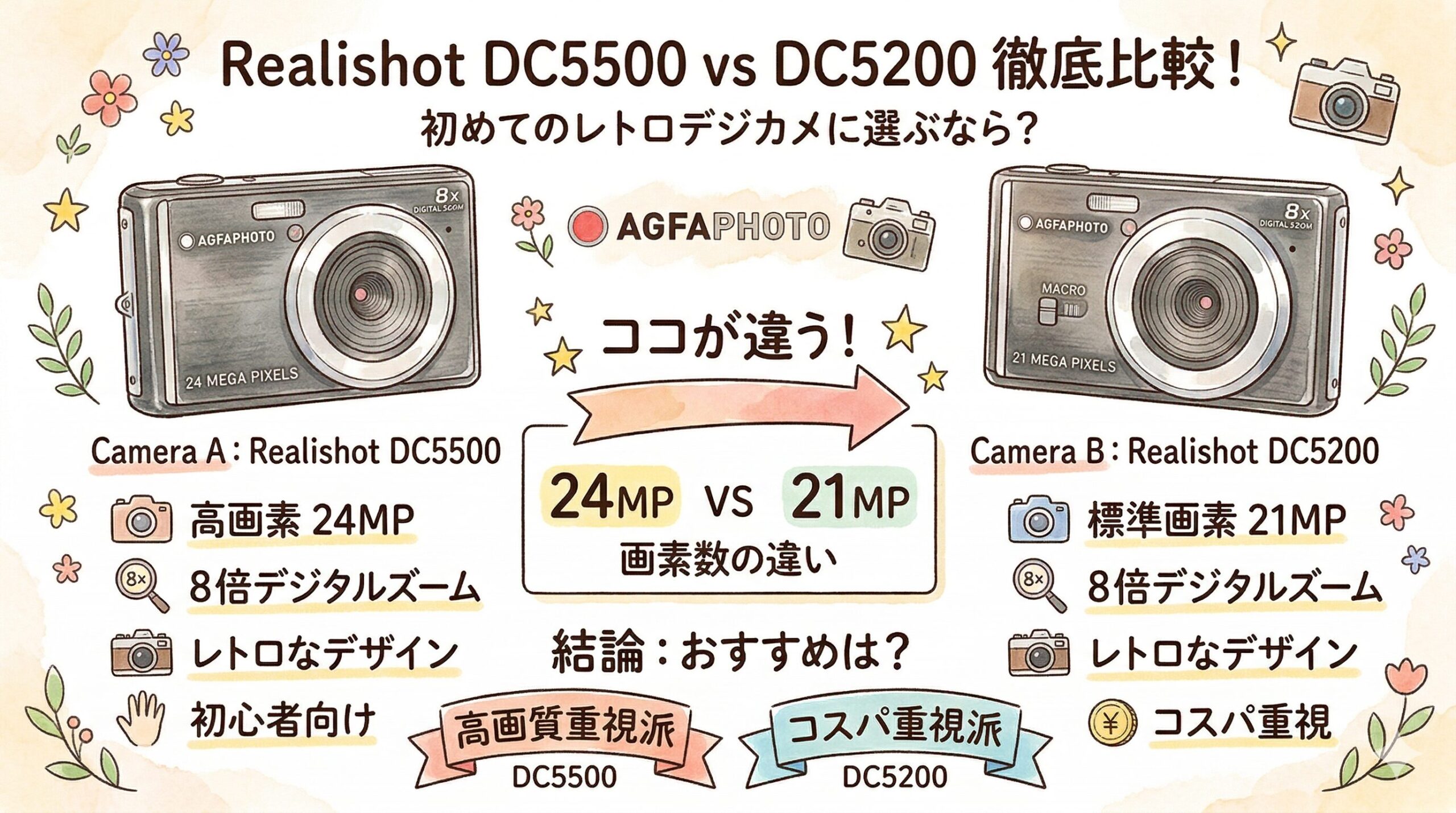 結論からいうと、初めての レトロデジカメ を気持ちよく始めたいなら Realishot DC5500、できるだけ出費を抑えて“エモい写り”を試したいなら Realishot DC5200 で十分です。