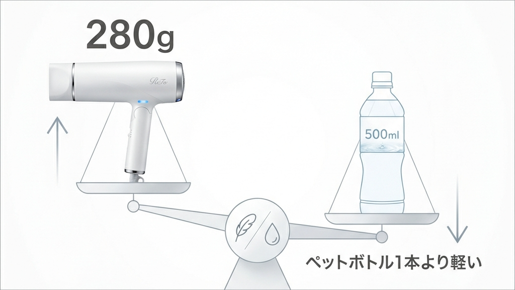 PRO(740g)の約3分の1という軽さは、毎日のドライ時間を「筋トレ」から「リラックスタイム」へと変えます。もう、乾かし終わった後に腕をさする必要はありません。