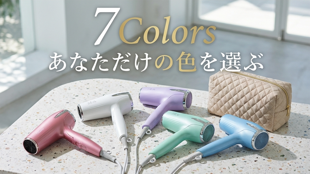 定番のホワイト、ブラックに加え、パステル調のピンク、グリーン、パープルなど、インテリアや好みに合わせて選べるラインナップが揃っています。「ドライヤーは家電」という枠を超え、「私のためのビューティー雑貨」として選ぶ楽しさがあります。洗面所に置いてあるだけで気分が上がる色はどれか、想像してみてください。