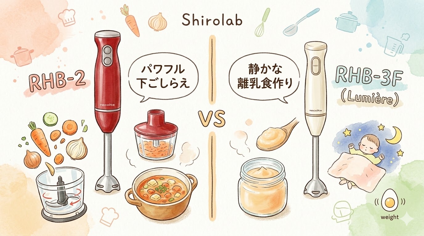 離乳食メインなら、基本はRHB-3Fがおすすめです。軽くて扱いやすく、チョッパー付きで成長後の刻み調理にもつなげやすいからです。
