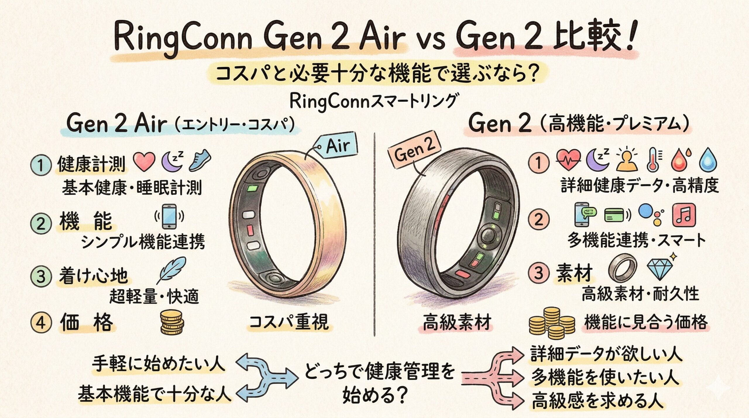 この記事では、公式情報とレビューをもとに、RingConn Gen 2 AirとRingConn Gen 2の差を、購入判断に直結するところだけに絞って整理しました。