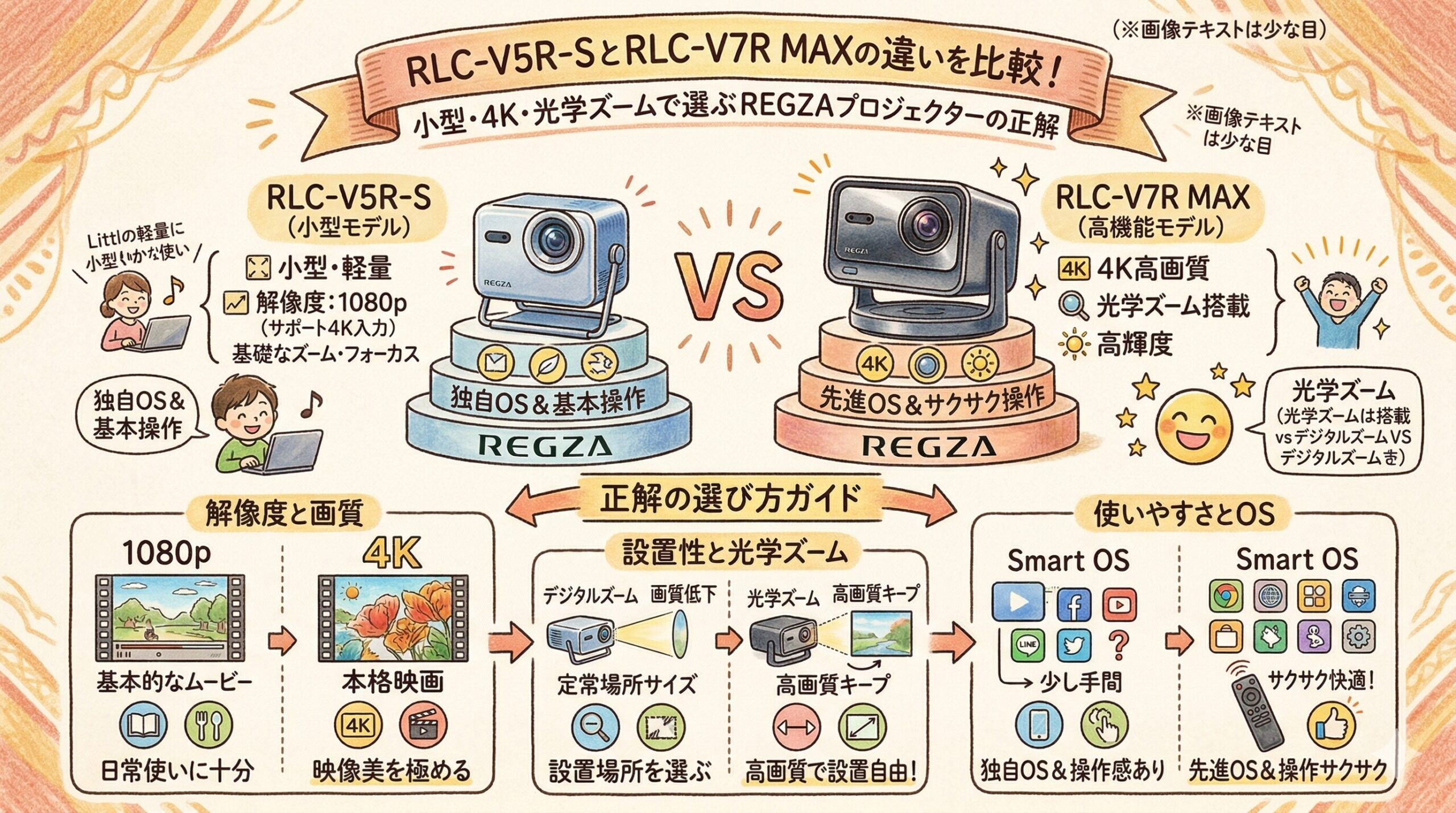 RLC-V5R-S は「小さいのに4Kが楽しめる価値」、RLC-V7R MAX は「リビング常設で満足度を取り切る価値」を買うモデルだということです。