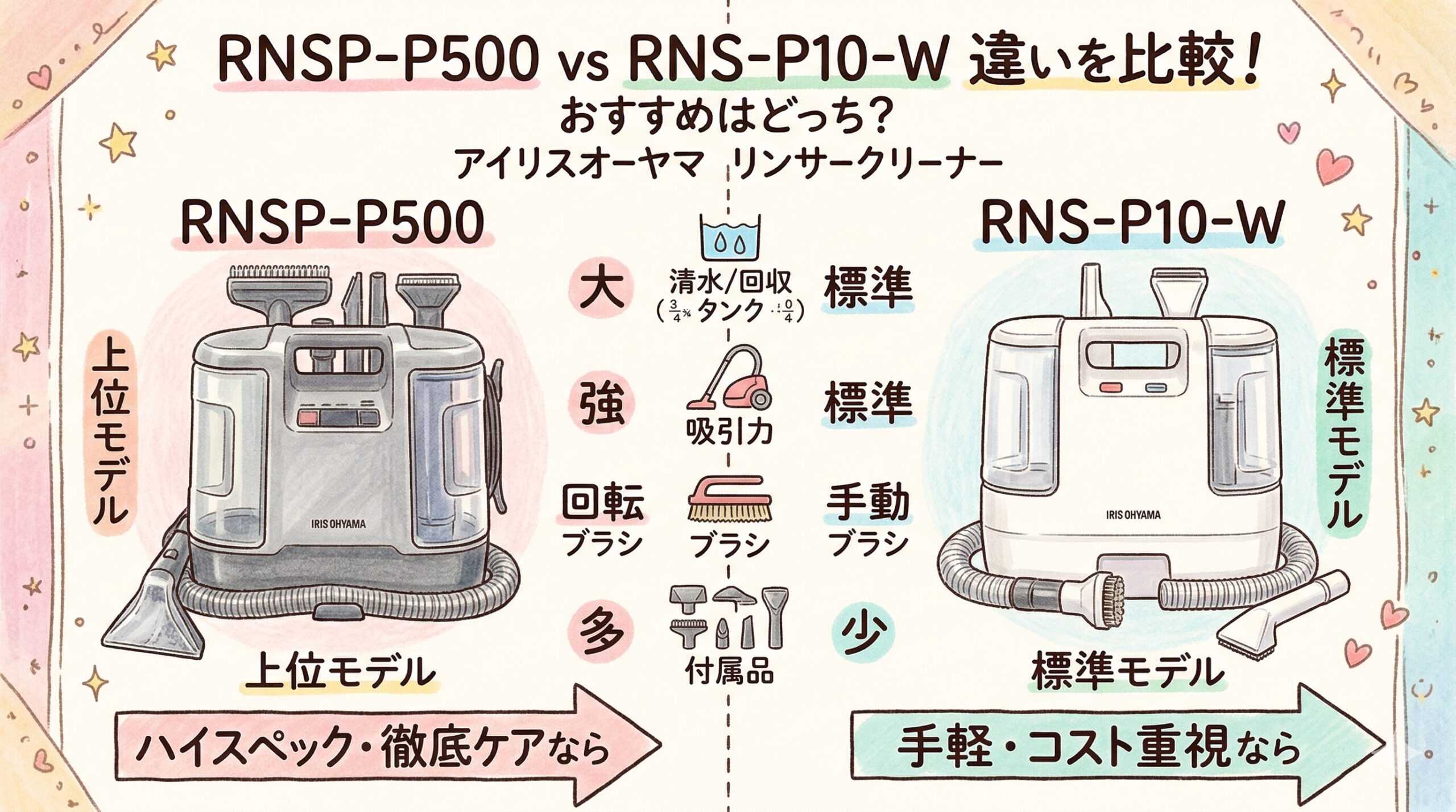 - 違い3|吸う力より“広い面を洗う疲れにくさ”でRNSP-P500が優勢