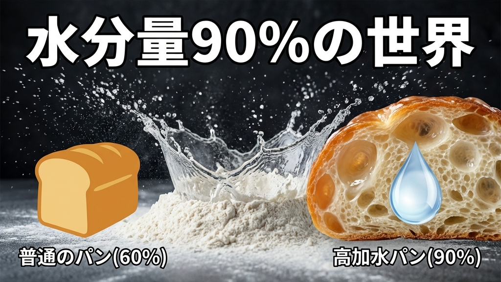 普通の食パンの水分率(粉に対する水の割合)は60〜65%程度です。これに対し、高加水パンは70〜90%もの水分を含ませます。