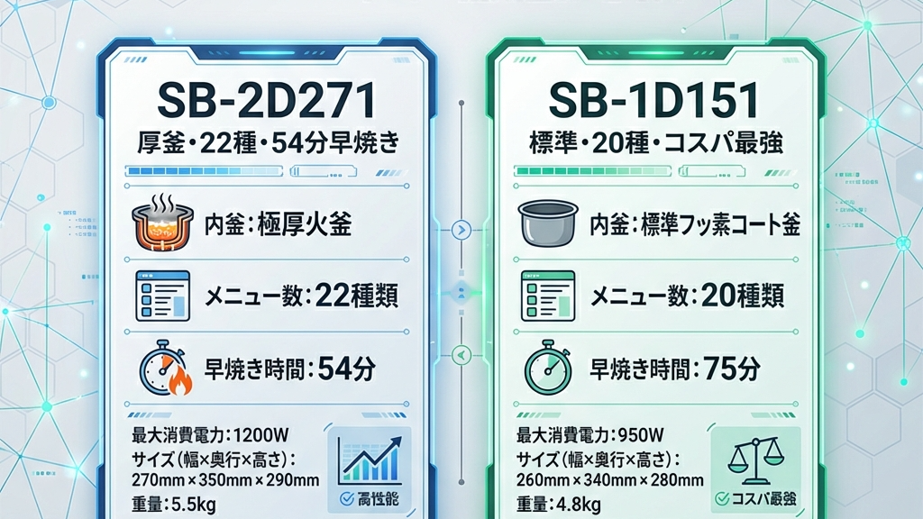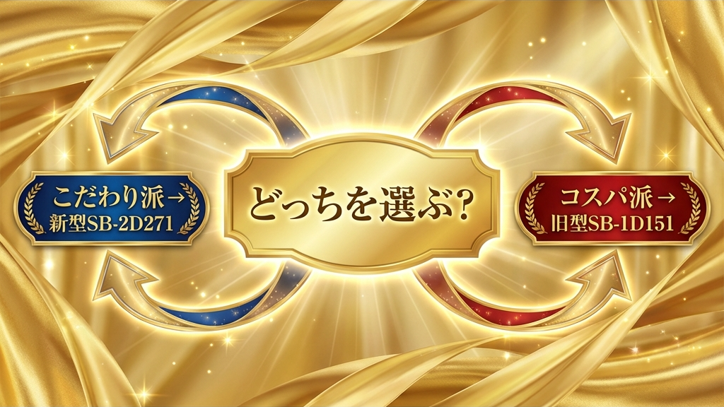 本記事では、この疑問に白黒つけるべく、新型「SB-2D271」と旧型「SB-1D151」を徹底的に比較検証します。スペック表の数字合わせではなく、「毎日の朝食がどう変わるか」「5年間使った場合の満足度はどうか」という、あなたの生活に直結する視点だけで評価を行いました。