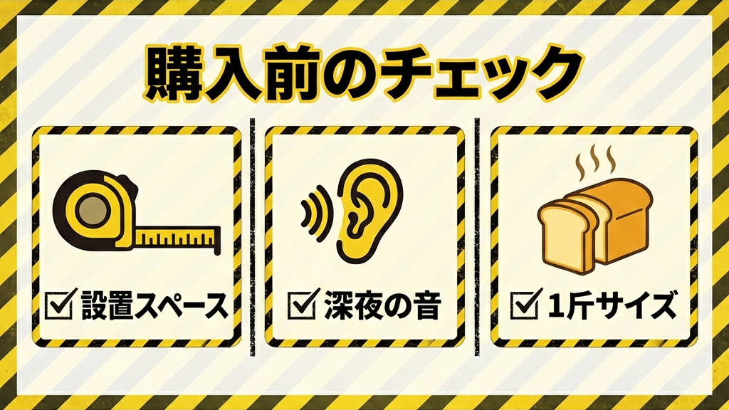 集合住宅で深夜にタイマー機能を使って焼く場合、寝室とキッチンが近いと音が気になる可能性があります。音に敏感な方は、設置場所を工夫するか、就寝中にこね工程が入らないように時間を調整しましょう。