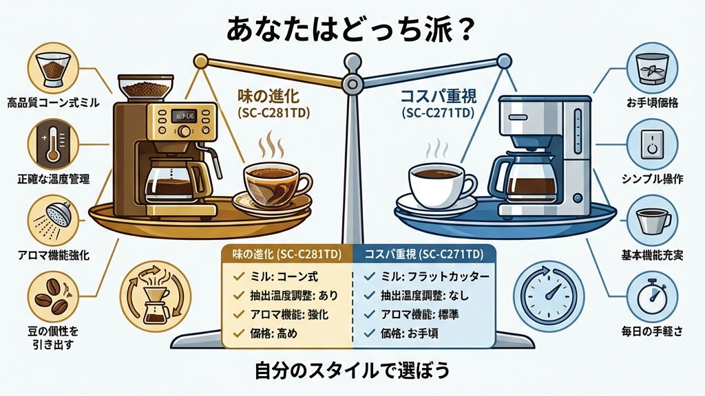 | 項目 | SC-C281TD(新・味重視) | SC-C271TD(旧・コスパ重視) | 判定 |
