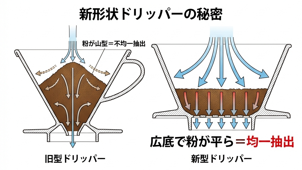 | ドリッパー形状 | 新形状(広底) 抽出ムラが減り、雑味が少ない | 従来形状 一般的な円錐型 | 新モデルの圧勝 |