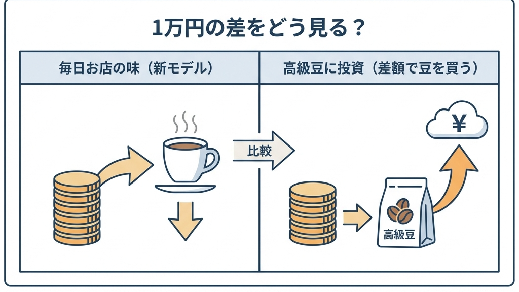 「味への投資」と考えます。毎日飲むコーヒーがお店の味に近づくなら、1万円は半年もあれば元が取れます(カフェ代の節約)。