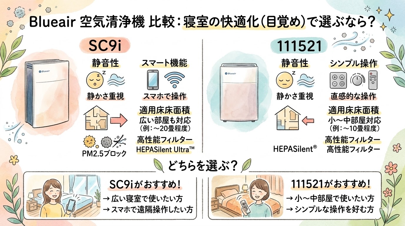 SC9iと111521の違いを比較すると、いちばん大きいのは空気清浄性能の差よりも、寝室での過ごし方まで含めて設計されているかどうかです。