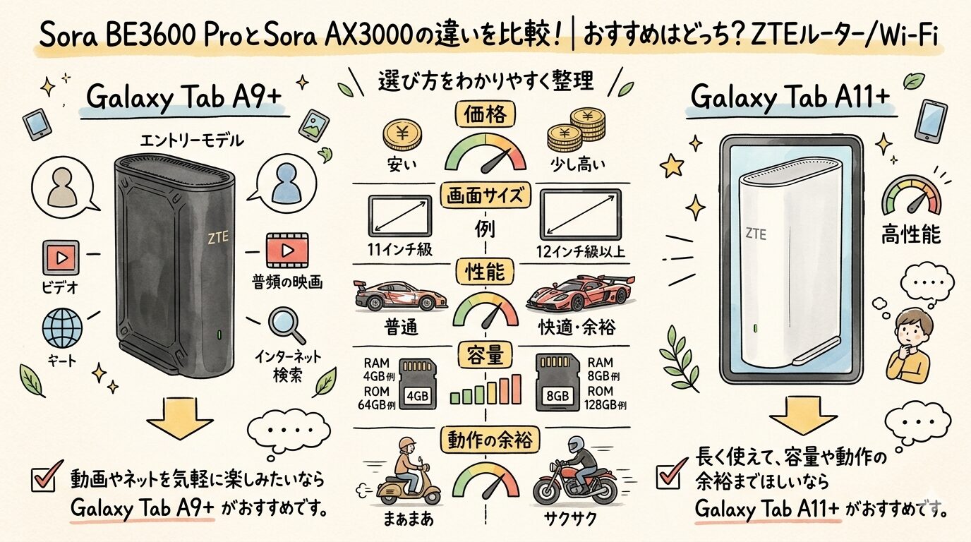 今回は、ZTE Sora BE3600 ProとZTE Sora AX3000の違いを、初心者でも判断しやすいように「何が変わったか」より「誰に効く差か」で整理します。