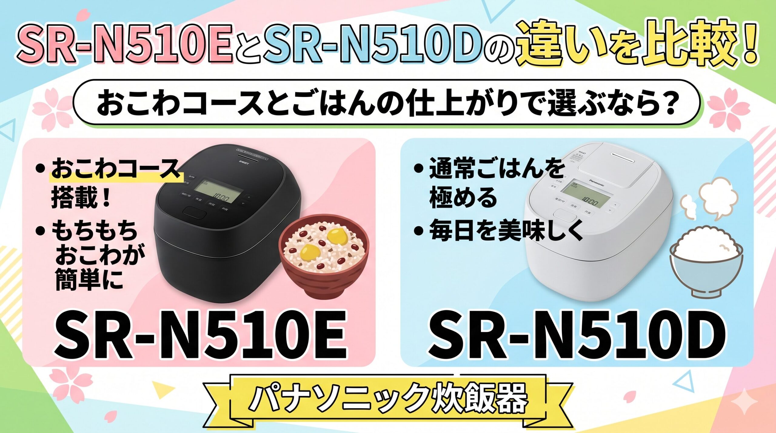 本記事では、SR-N510ESR-N510Dの違いを、おこわコース・炊き上がり・消費電力・価格・口コミ傾向までふまえて比較します。