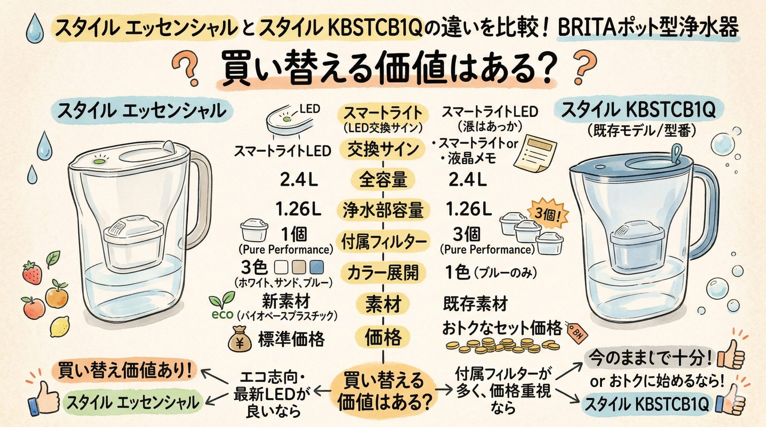 スタイル エッセンシャル と スタイル KBSTCB1Q の違いは、浄水ポットとしての土台より、毎日の使い心地にあります。
