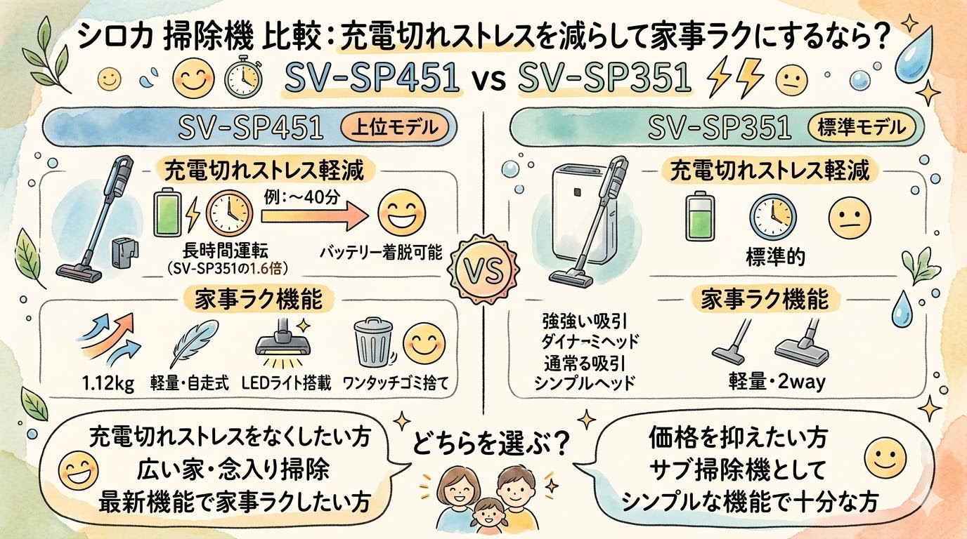 短時間の掃除が中心ならSV-SP351でも十分です。ですが、部屋数が増えたり、週末にまとめて掃除することが多いならSV-SP451のほうが使いやすいです。