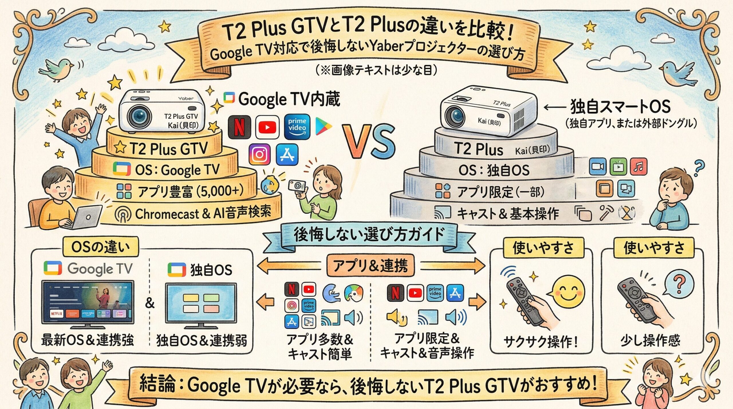 結論から言うと、動画視聴をテレビみたいに気軽に始めたいなら T2 Plus GTV、少しでも出費を抑えて初めての1台を試したいなら T2 Plus が向いています。