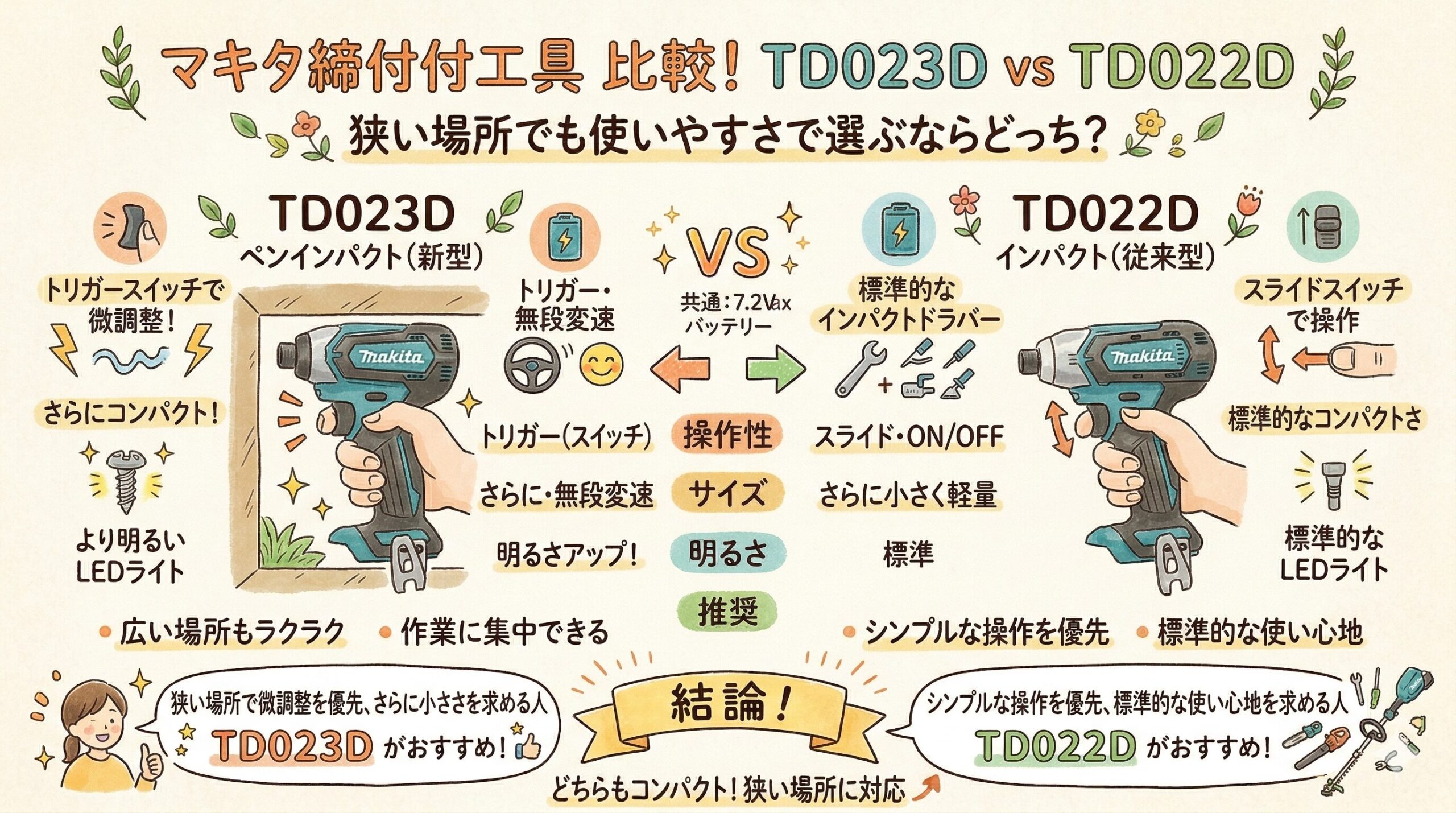 結論からいうと、はじめて買う人や、狭所作業で“扱いやすさ”を最優先したい人にはTD023Dがおすすめです。