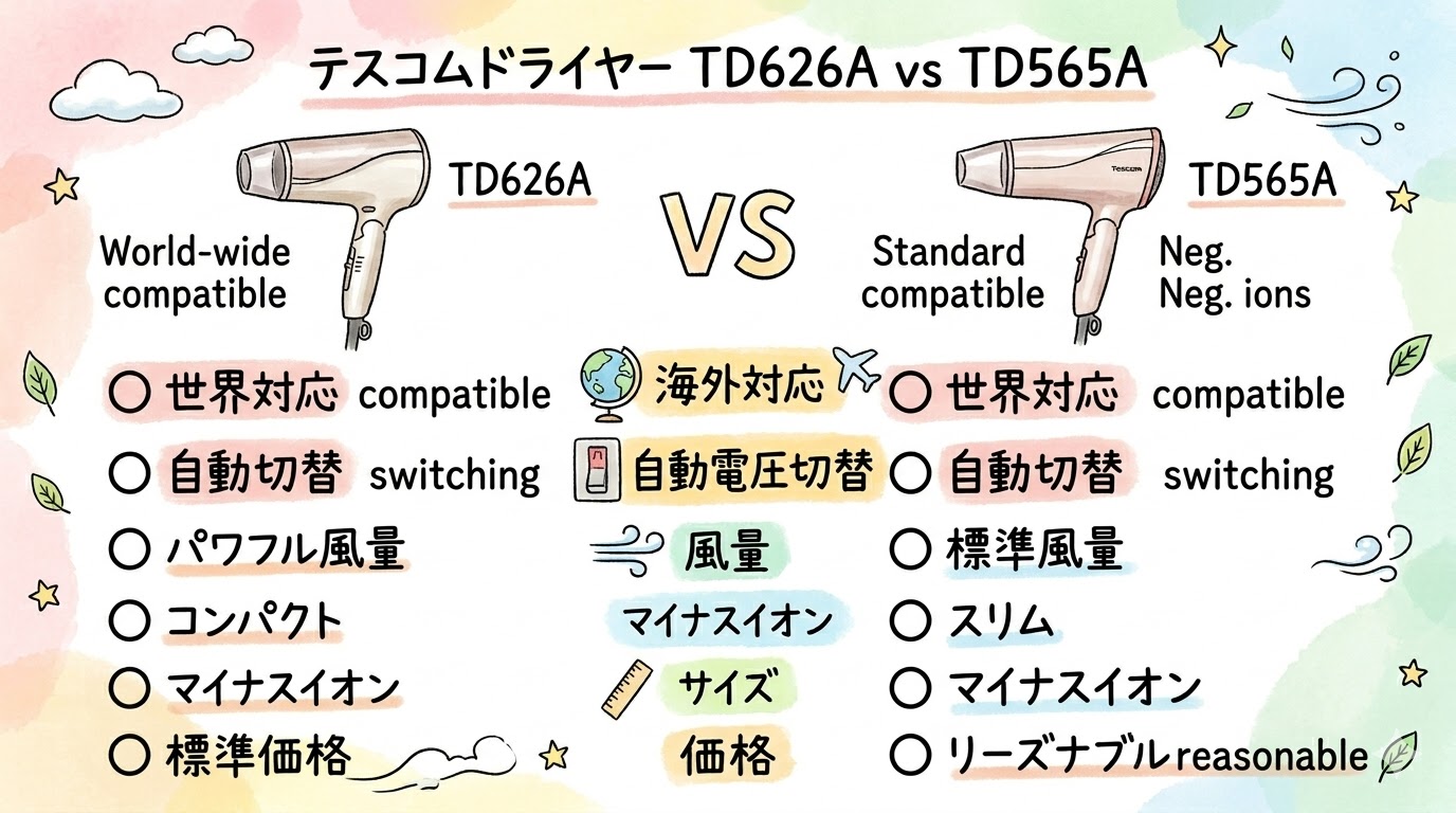 A. 国内だけなら電圧切替の差は関係ないため、風量・イオン機能・予算で選びましょう。パワーを求めるならTD626A、コスパ重視ならTD565Aです。
