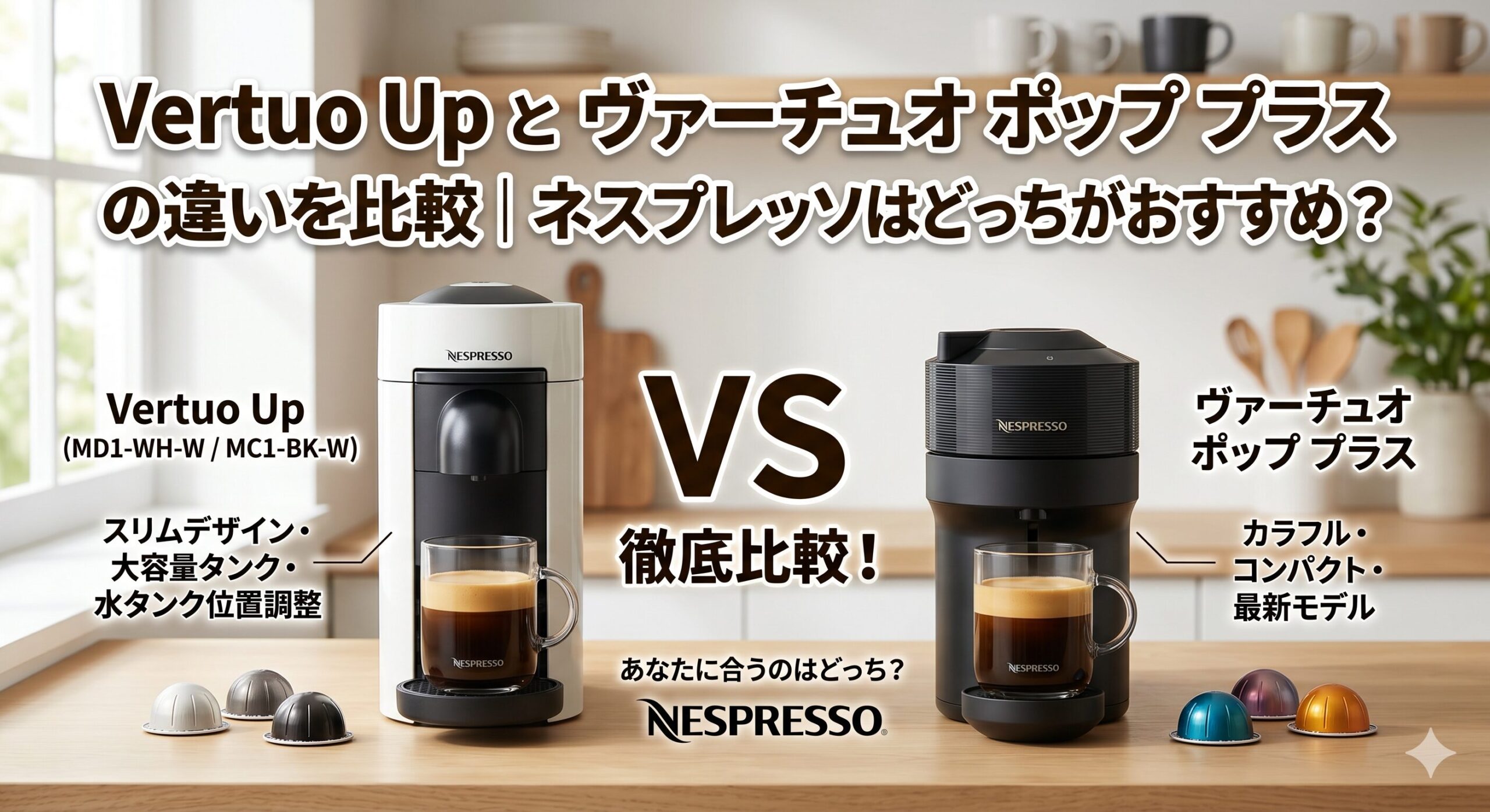 Vertuo Up(MD1-WH-W / MC1-BK-W) と ヴァーチュオ ポップ プラス を比べると、機能重視なら Vertuo Up、価格重視なら ヴァーチュオ ポップ プラス という整理がいちばんわかりやすいです。