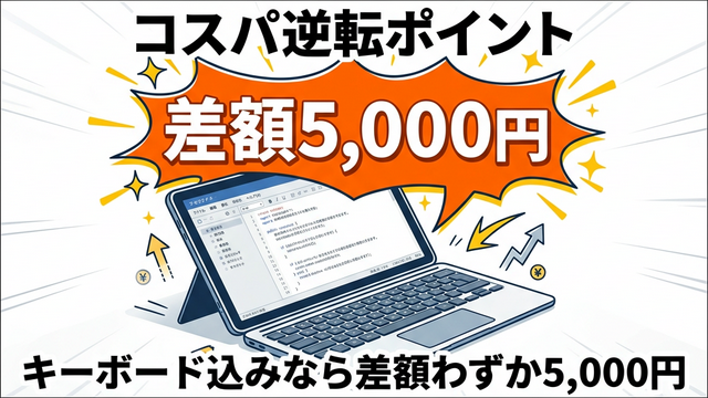 本体だけなら15,000円あった差が、キーボード込みだとわずか5,000円差(下取りボーナス込みならたった3,000円差)まで縮まります。