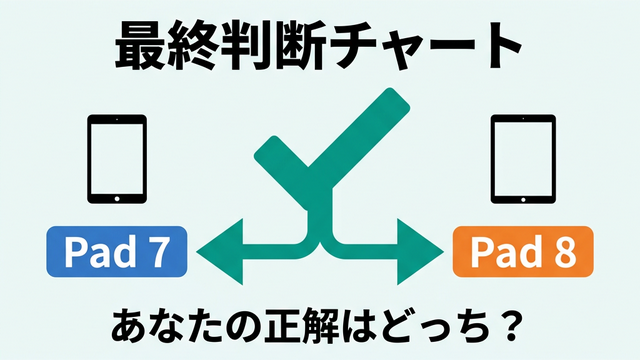 前セクションで解説したとおり、キーボード込みの総額差はたった5,000円(下取りボーナス込みなら3,000円)。この差額でSoC・OS・Wi-Fi・軽さがすべて最新世代になるので、キーボード前提であればPad 8を選ばない理由がほとんどありません。